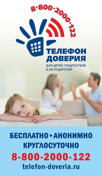 Детский телефон доверия (8-800-2000-122) является службой экстренной психологической помощи по телефону детям, подросткам, переживающим трудную жизненную ситуацию, родителям, лицам их заменяющим, специалистам, работающими с детьми и семьями. Служба детского телефона доверия (8-800-2000-122) является одним из важных ресурсов помощи детям и подроскамв их социализации, развитии способностей к предупреждению и консруктивному преодолению конфликтов.